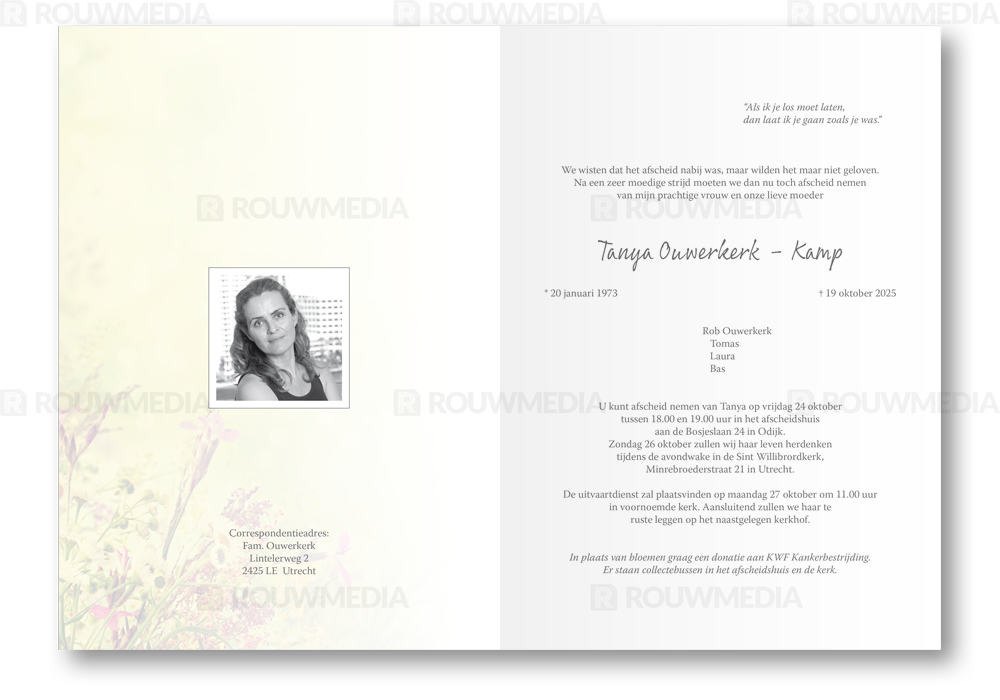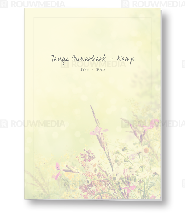 Voor deze staande rouwkaart is een dun grijs kader gebruikt dat in de rechterhoek wordt onderbroken door een afbeelding van zomerse veldbloemen.