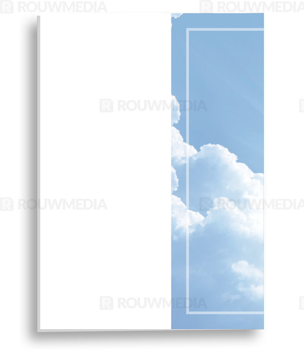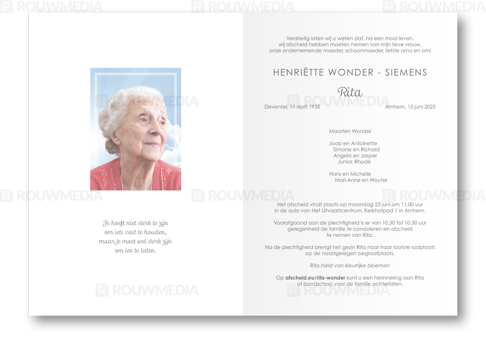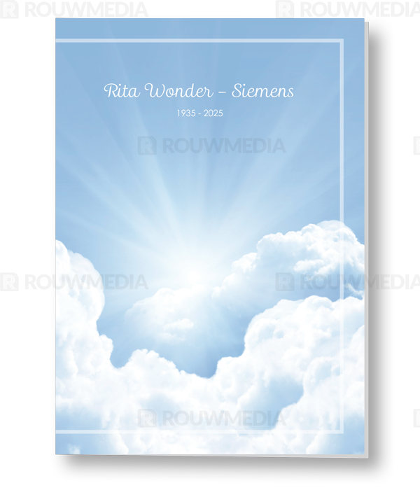 In de staande rouwkaart wordt een beeldvullende foto weergegeven van de zon achter de wolken.