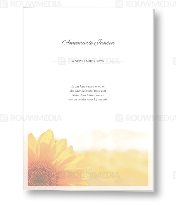 In deze staande rouwkaart wordt een beeldvullende afbeelding weergegeven van een zonnebloem. Daarnaast is het mogelijk om de naam, datums en gedicht/citaat weer te geven.
