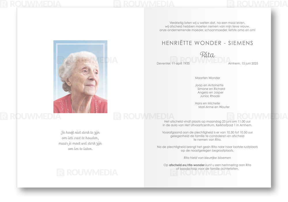 In de staande rouwkaart wordt een beeldvullende foto weergegeven van