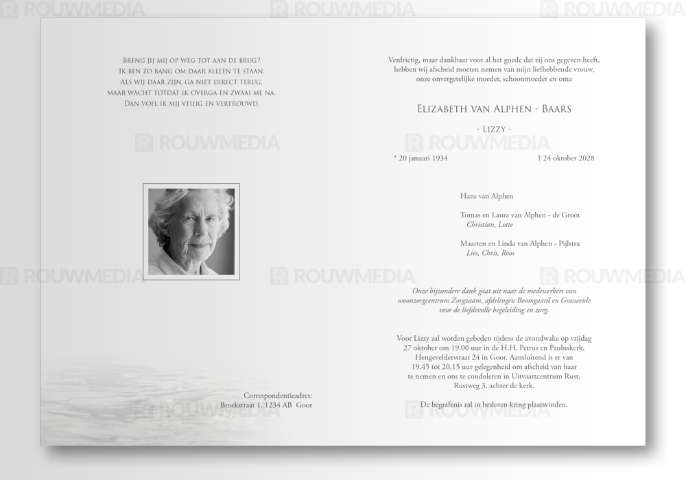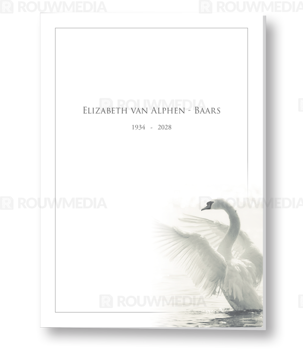Rouwkaart met een zwaan. Aan de binnenkant kan een eigen foto toegevoegd worden.