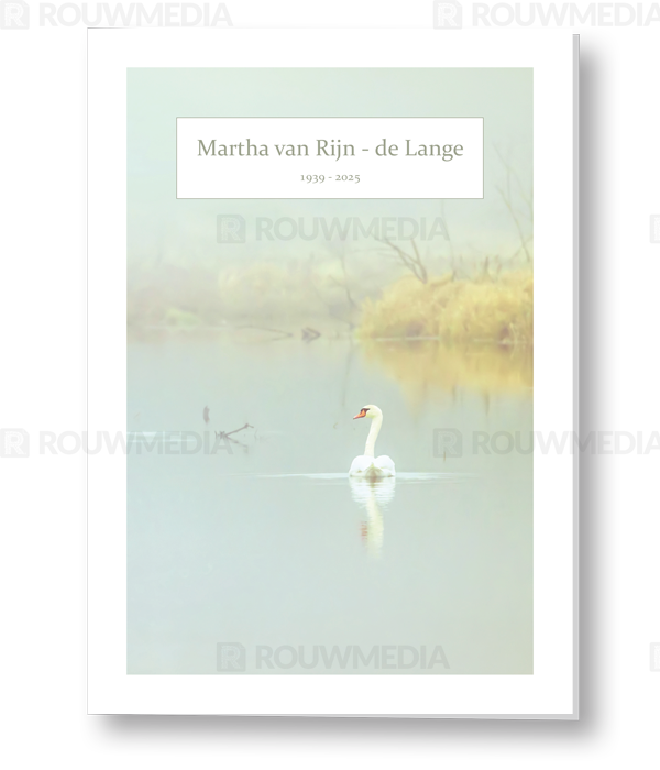 In de staande rouwkaart wordt een beeldvullende foto weergegeven van een zwaan in het water.
