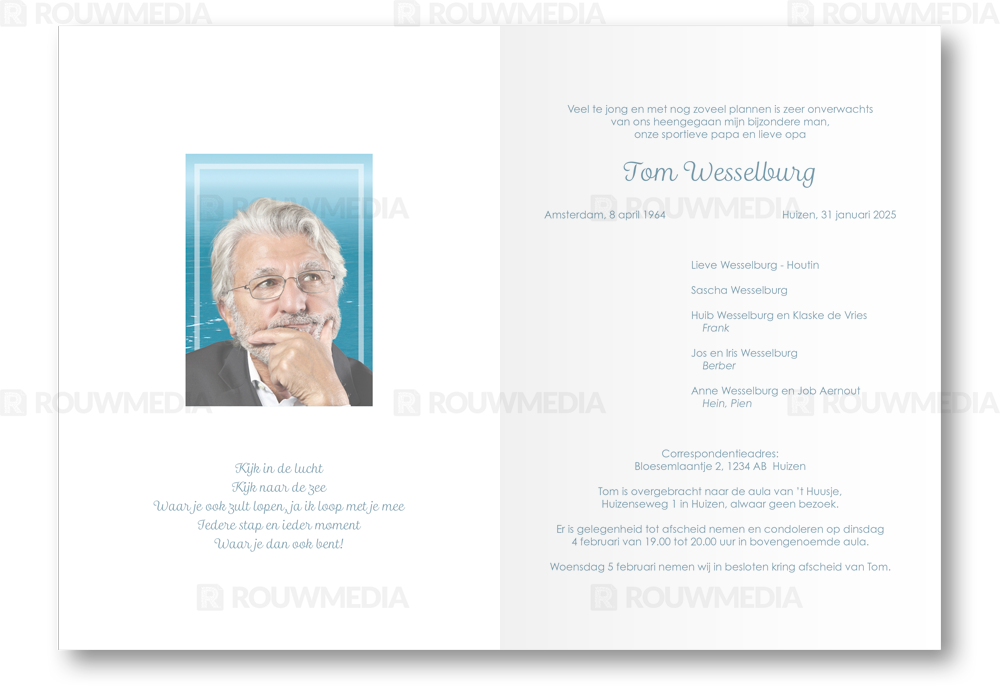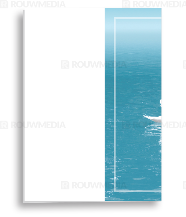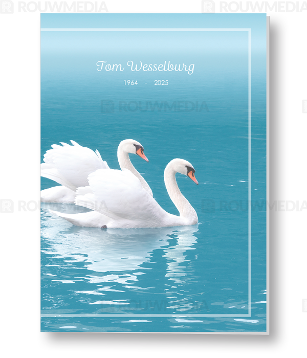 In de staande rouwkaart wordt een beeldvullende foto weergegeven van een zwaan op het water.