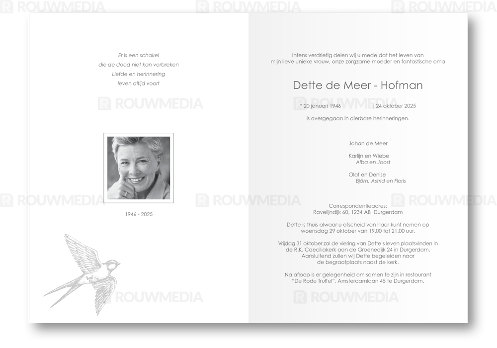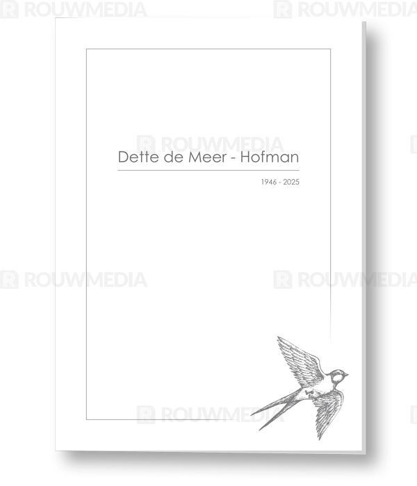 Deze rouwkaart toont in een simpele stijl hoe een afbeelding de focus kan krijgen in een kaart, maar wel de serene rust bewaart. Voor deze kaart is er gekozen voor geïllustreerde zwaluw.