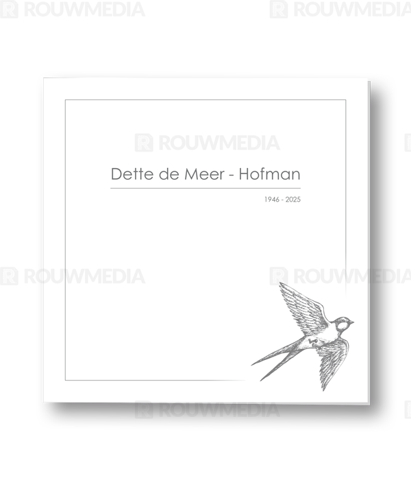 Deze vierkante rouwkaart toont in een simpele stijl hoe een afbeelding de focus kan krijgen in een kaart, maar wel de serene rust bewaart. Voor deze kaart is er gekozen voor geïllustreerde zwaluw.