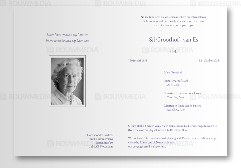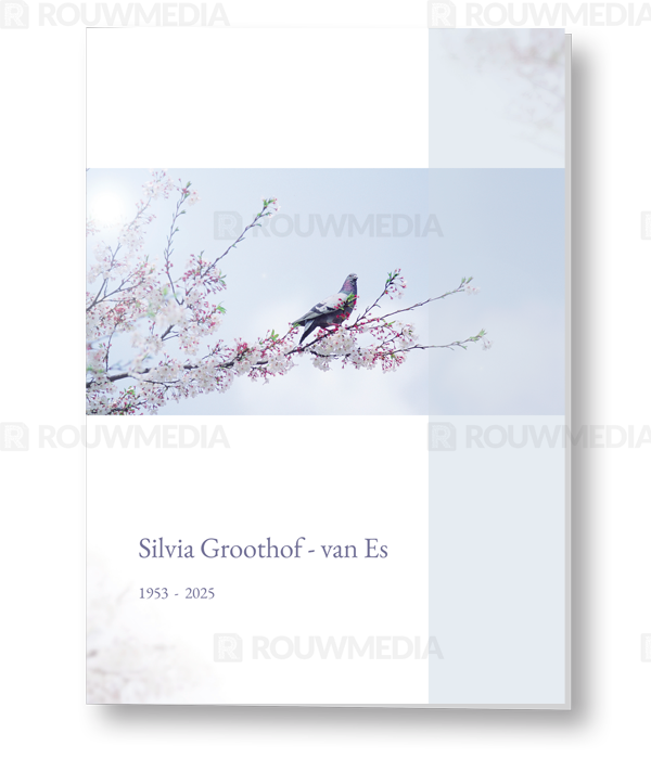 Rouwkaart met afbeelding van een vlinder op een bloesemtak. Aan de rechterkant wordt een transparante balk weergegeven om de kaart wat meer kleur te geven en speelser te maken.