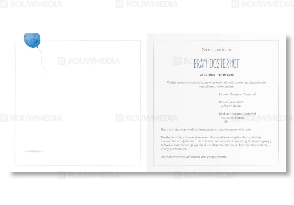 Rouwkaart voor kind met een blauwe ballon en een mooi gedichtje op de voorkant de ballon komt ook terug op de binnenzijde