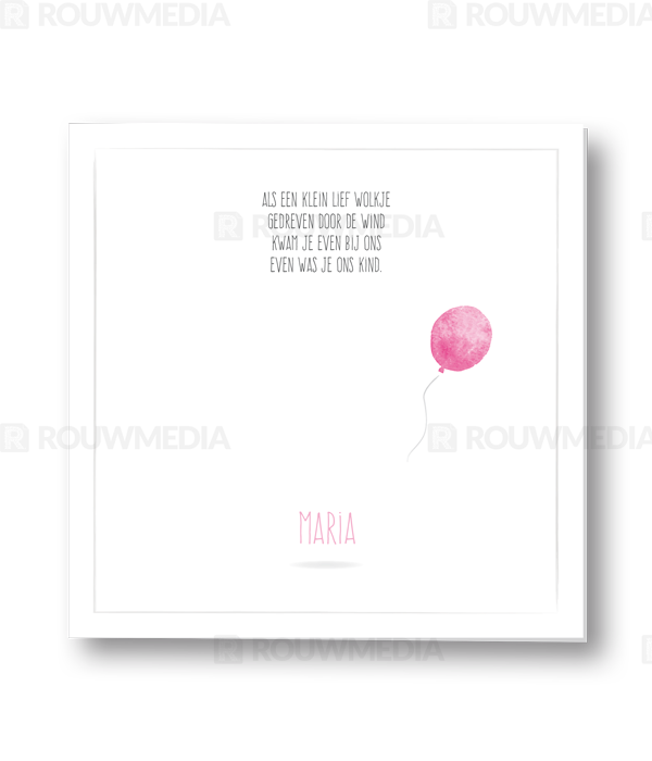 Rouwkaart voor kind met een roze ballon en een mooi gedichtje op de voorkant de ballon komt ook terug op de binnenzijde