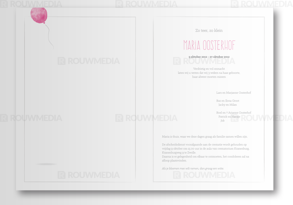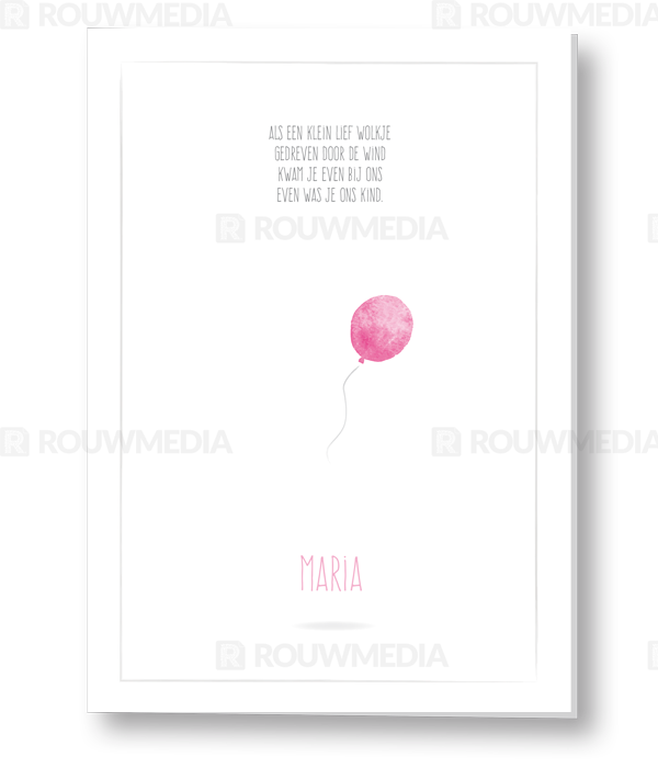 Rouwkaart voor kind met een roze ballon en een mooi gedichtje op de voorkant de ballon komt ook terug op de binnenzijde