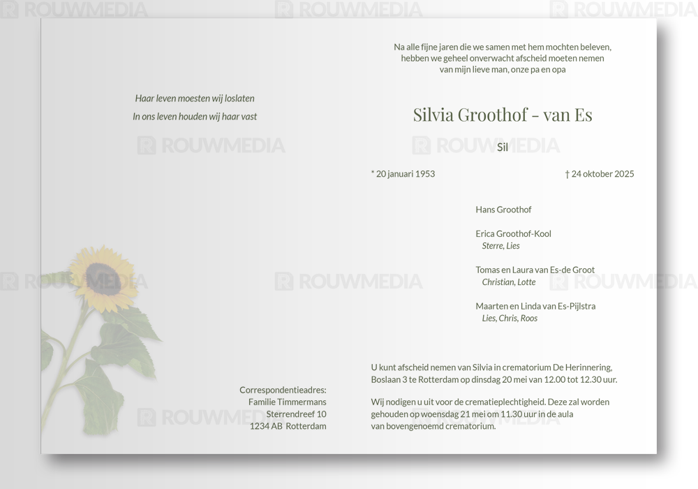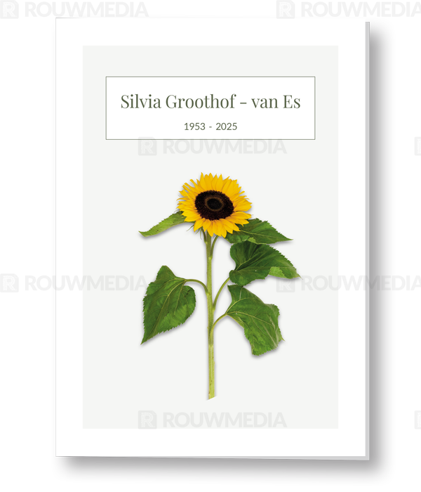 In deze rouwkaart staat de zonnebloem centraal. Door de organische vormen en zachte kleuren krijgt de kaart een rustige uitstraling.
