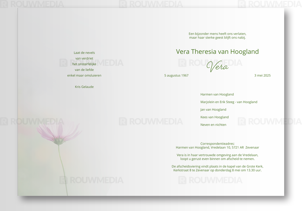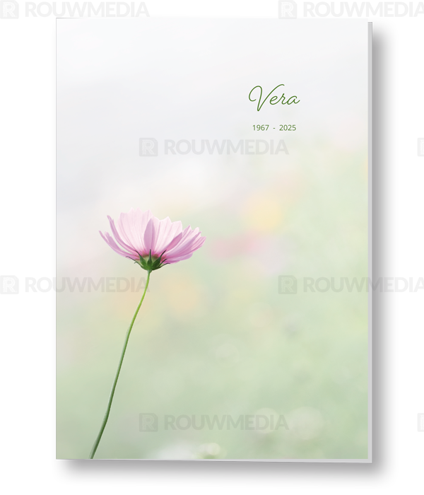 Deze staande rouwkaart toont een roze bloem in de natuur.