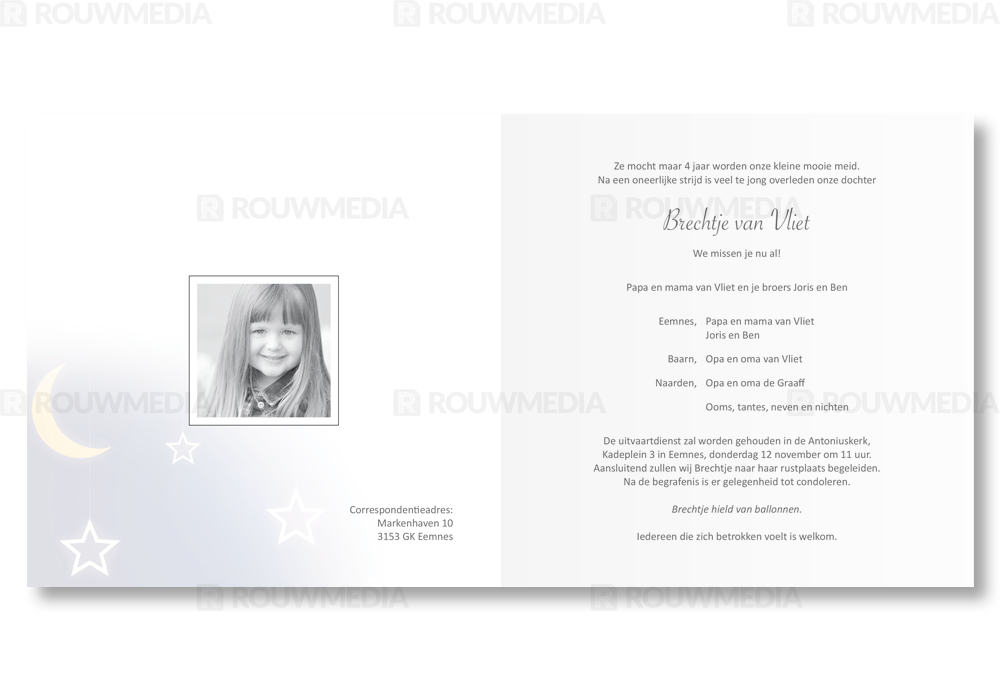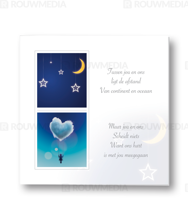 Een mooie rouwkaart voor een overleden kind voorzien van sterren en de maan. Binnenin is ruimte voor een eigen foto.