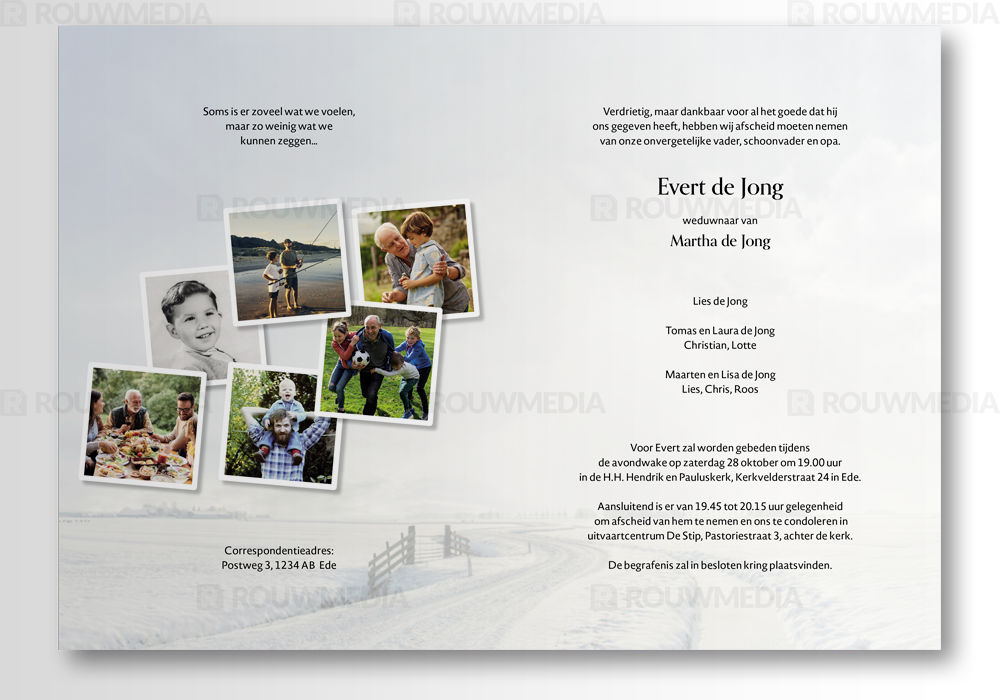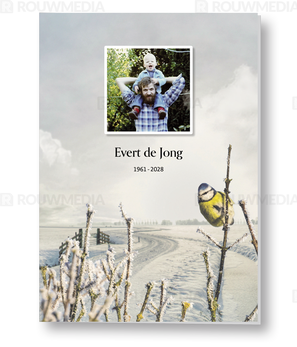Rouwkaart met als thema Sneeuw biedt de mogelijkheid om eigen portret/afbeelding weer te geven in de stijl van de virtuele rouwkaart Sneeuw (E3014). Dit product is zowel in combinatie met de virtuele rouwkaart te bestellen als afzonderlijk. Aan de binnenzijde is het mogelijk om meerdere afbeeldingen terug te laten komen.