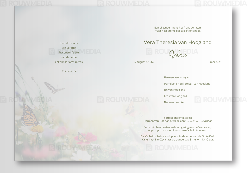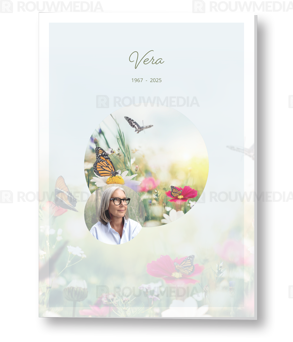 Deze staande rouwkaart toont enkele veldbloemen en vlinders met een portretfoto erin verwerkt.
