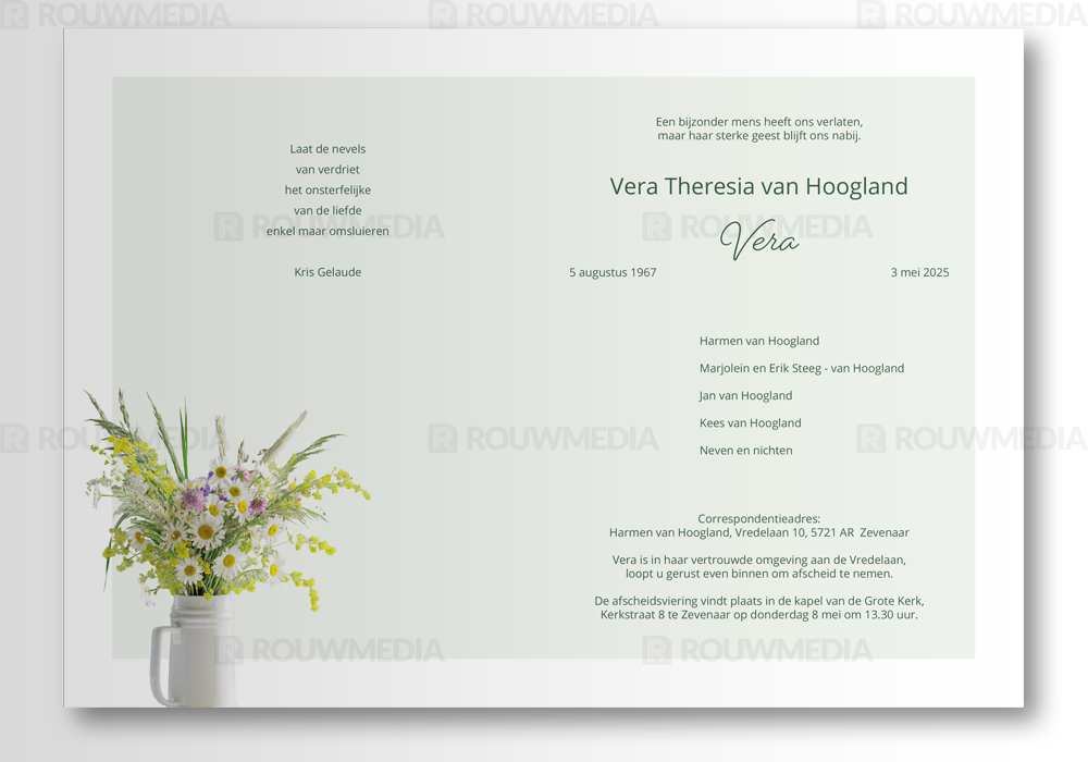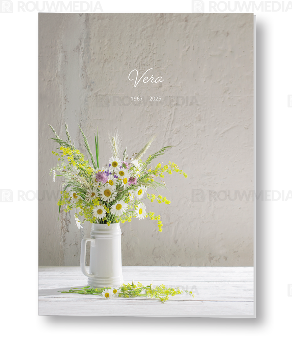 Deze staande rouwkaart toont een bos veldbloemen in een vaas.