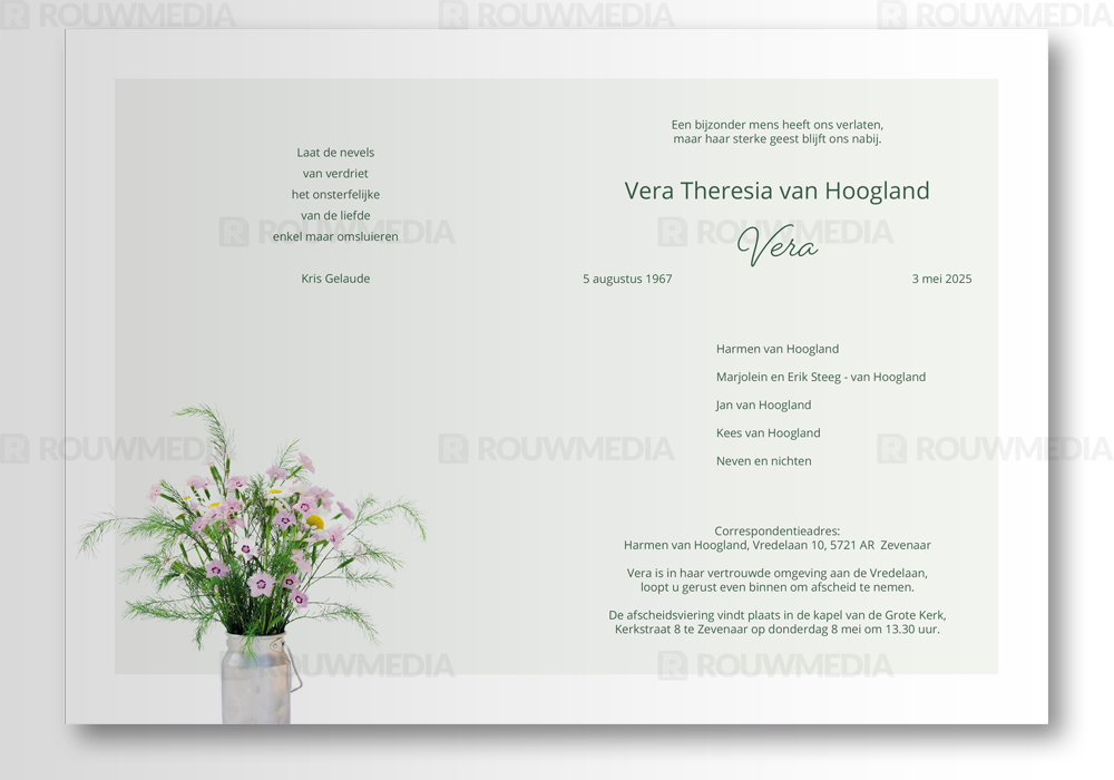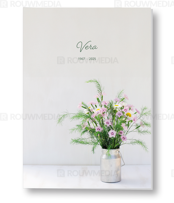 Deze staande rouwkaart toont enkele veldbloemen in een vaas.