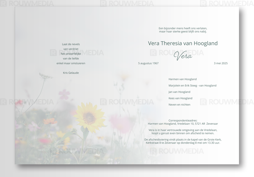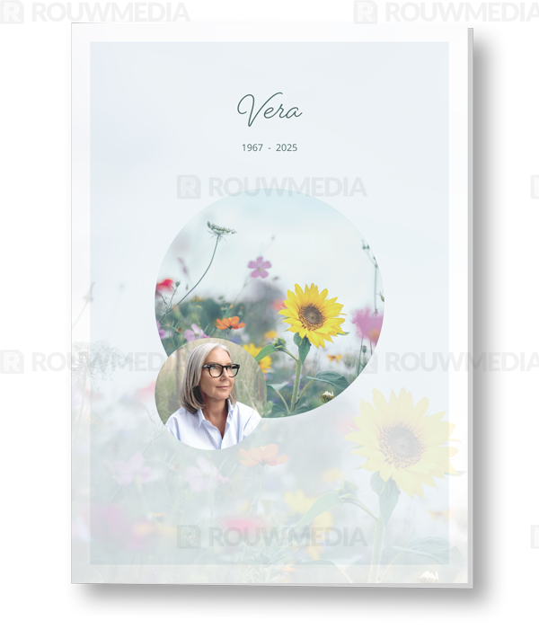 Deze staande rouwkaart toont enkele veldbloemen met een portretfoto erin verwerkt.