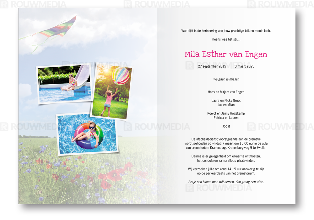 Rouwkaart met als thema Vlieger biedt de mogelijkheid om eigen portret/afbeelding weer te geven in de stijl van de virtuele rouwkaart Vlieger (E3011). Dit product is zowel in combinatie met de virtuele rouwkaart te bestellen als afzonderlijk. Aan de binnenzijde is het mogelijk om meerdere afbeeldingen terug te laten komen.