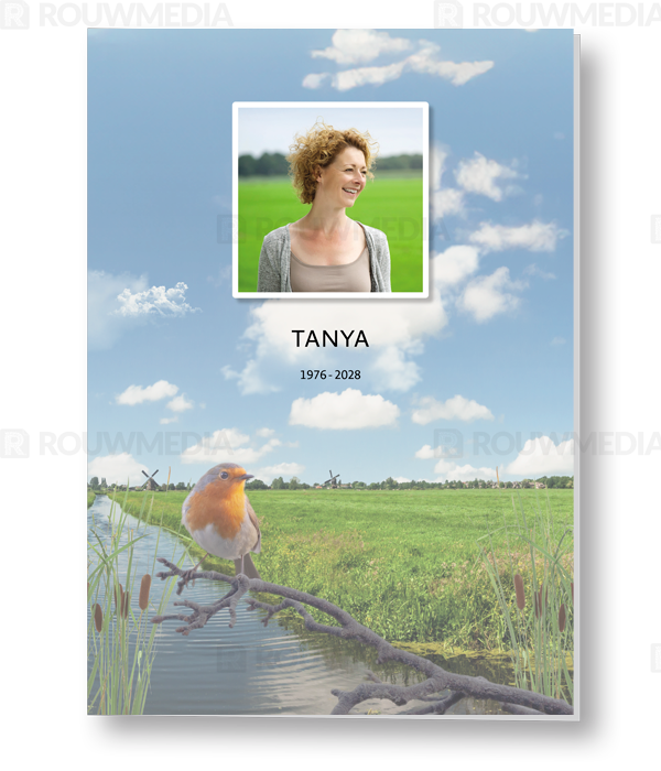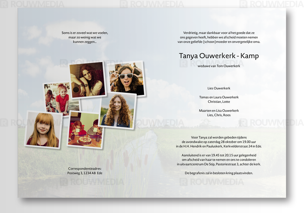 Rouwkaart met als thema Weiland biedt de mogelijkheid om eigen portret/afbeelding weer te geven in de stijl van de virtuele rouwkaart Weiland (E3013). Dit product is zowel in combinatie met de virtuele rouwkaart te bestellen als afzonderlijk. Aan de binnenzijde is het mogelijk om meerdere afbeeldingen terug te laten komen.