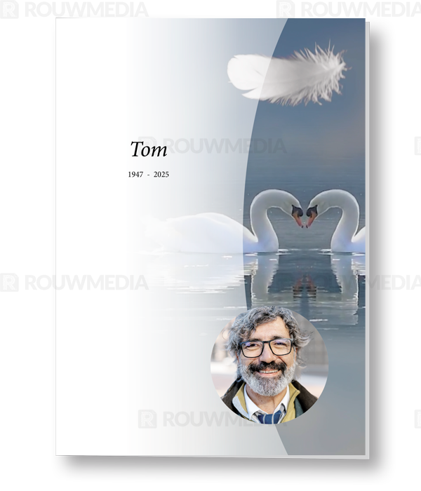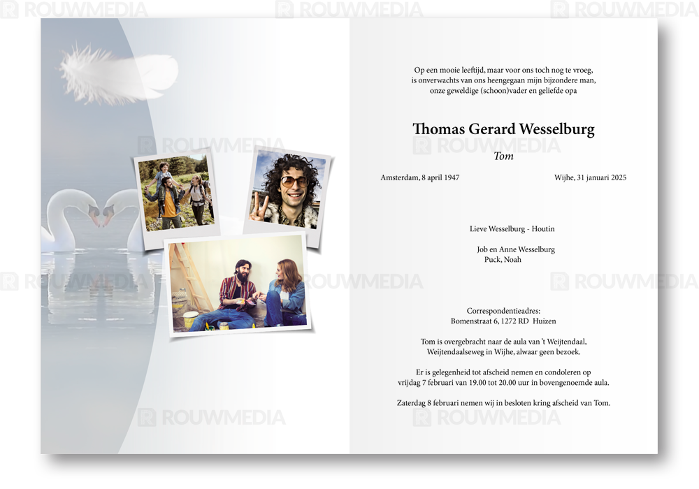 Rouwkaart met als thema Zwanen biedt de mogelijkheid om eigen portret/afbeelding weer te geven in de stijl van de virtuele rouwkaart Zwanen (E3007). Dit product is zowel in combinatie met de virtuele rouwkaart te bestellen als afzonderlijk. Aan de binnenzijde is het mogelijk om meerdere afbeeldingen terug te laten komen.